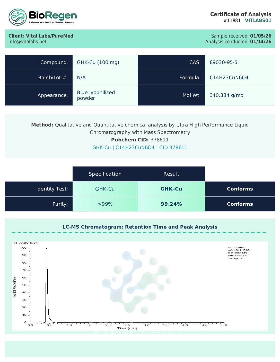 Vital Labs offers this product exclusively for research applications in the form of a (freeze-dried) powder. NO DOSAGE INDICATED ON THE PRODUCT. “This product is for research purposes only and not intended for, is a disclaimer commonly used to specify that the product should only be used in research settings, often in laboratories.